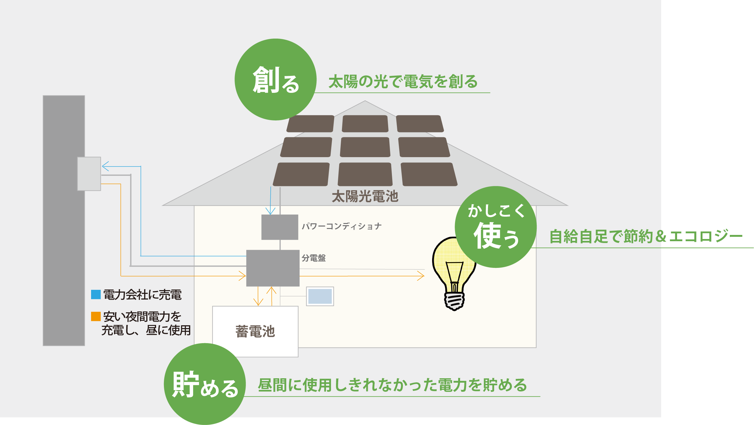 ご自宅で発電した電気を貯める、賢く使うという電力の自給自足が可能になるシステムです。